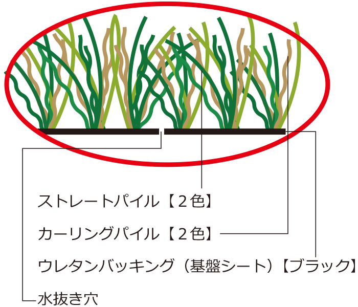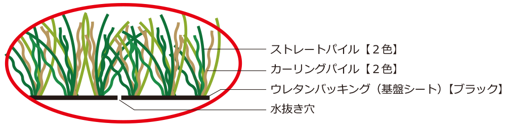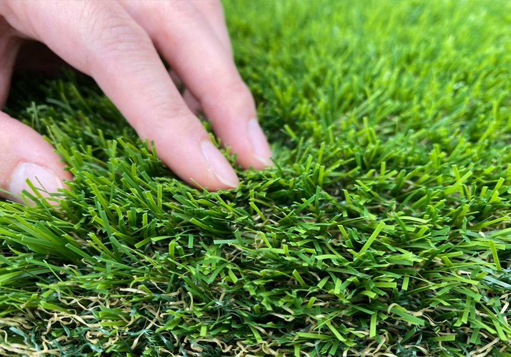 4種類のパイルを使用することで、天然芝と変わらぬ色合いを演出します。また、パイルは柔らかく肌触りも良いため、お子様やペットにも優しい環境を提供できます。